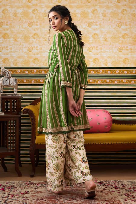 Beige jumpsuit featuring a floral botanical print throughout. Accompanied by a green peplum jacket with sequin embroidery and a front tie-up.