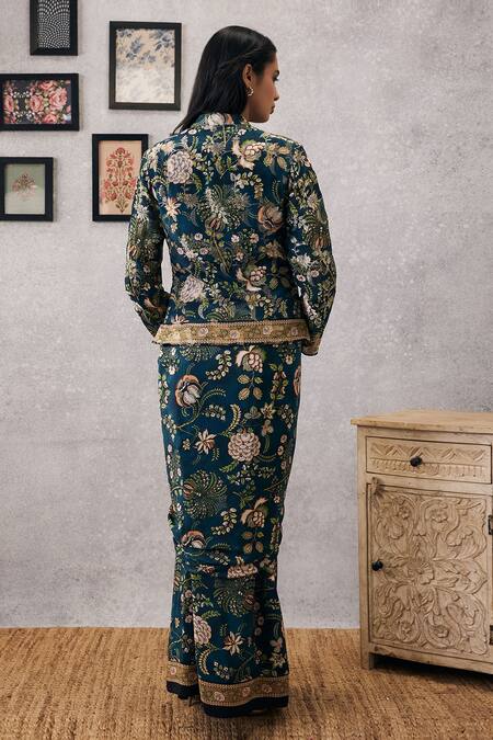 Green jacket featuring floral embroidery and a mandarin collar. Paired with a draped floral print skirt with embroidered sleeve hem.