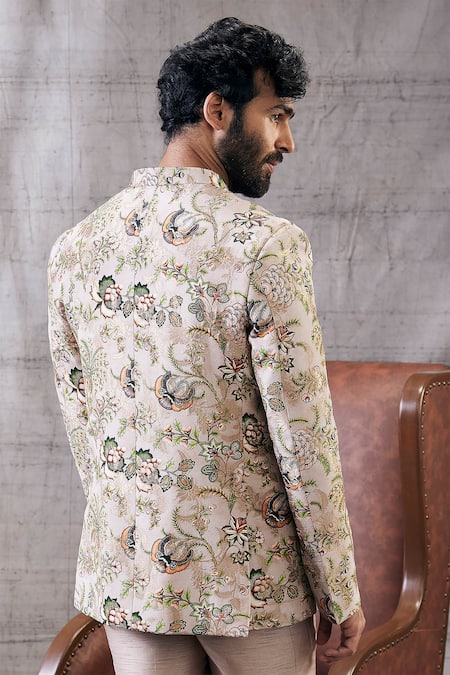 Beige Brocade, Silk Sequins, Embroidery Mehr Garden Print Bandhgala Set