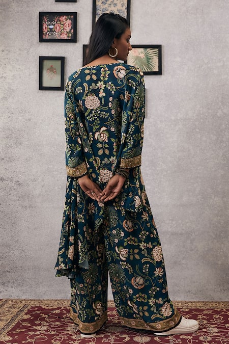 Green asymmetric kurta featuring garden print, round neckline, and long sleeves. Paired with flared pant with embroidered sleeve hem.