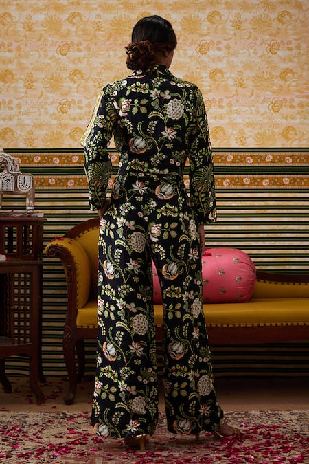 Black crop top featuring a camp collar neckline and full sleeves with an all-over midnight garden print. Paired with matching flared pants showcasing the same intricate print.