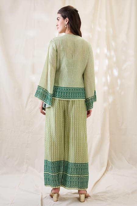 Green Linen Embroidery V-neck Noorani Embellished Angrakha Set