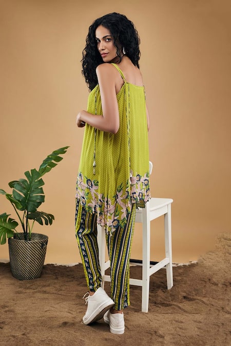 Green longline strappy top featuring orchid bloom embellishments and an asymmetric hem. Paired with printed pants in coordinating colors.