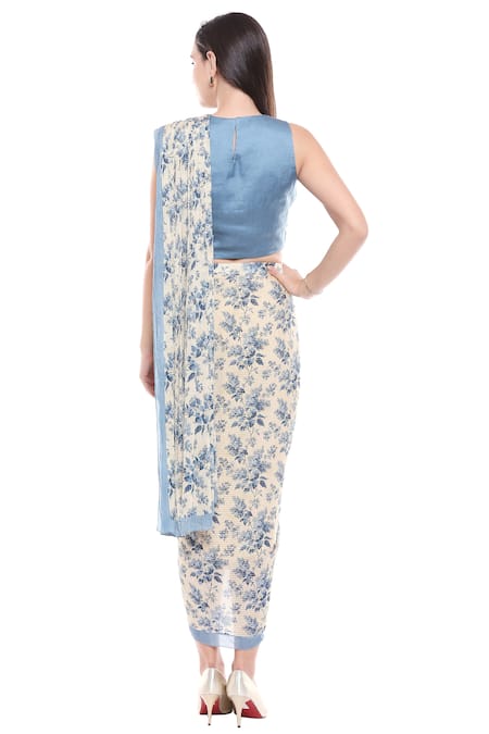 Off-white pre-pleated saree with all-over floral motif prints. Comes with embellished blue blouse.