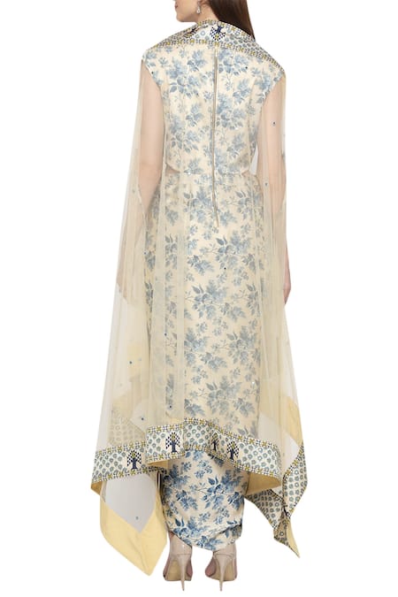 Off white satin draped dress with floral printed motifs & sequin embroidery. Paired with net embroidered cape.
