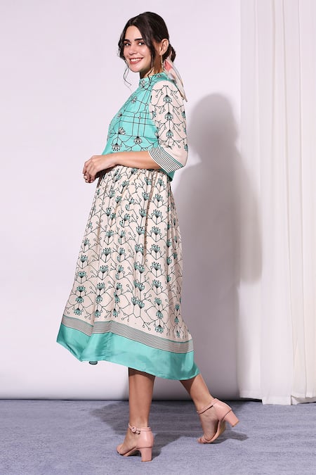 Off-white dress with all-over floral print, round neckline, gathers at the waist and flared silhouette. Comes with sea green sleeveless jacket.