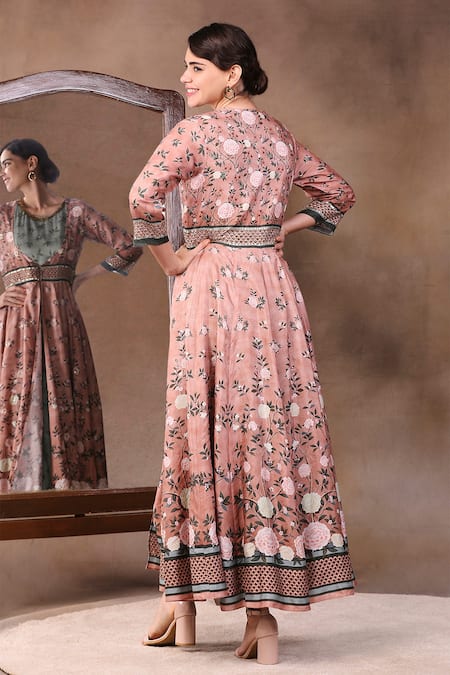 Peach anarkali style jacket with floral printed motifs and sequin embellishment. Comes with green dress inside.