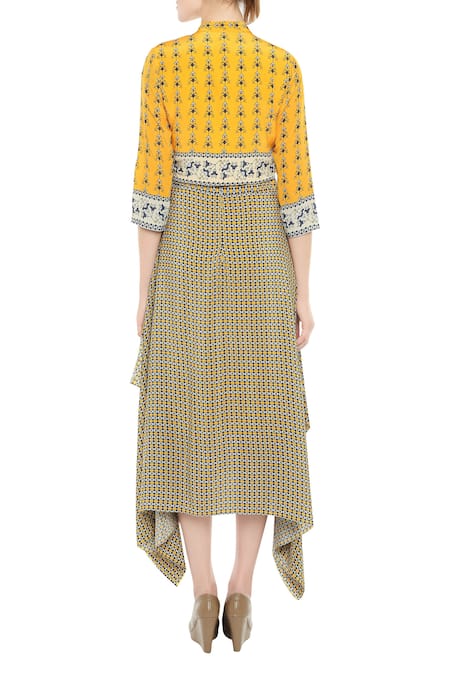 Yellow midi dress with side trails & asymmetric hemline. Paired with contrast printed jacket.