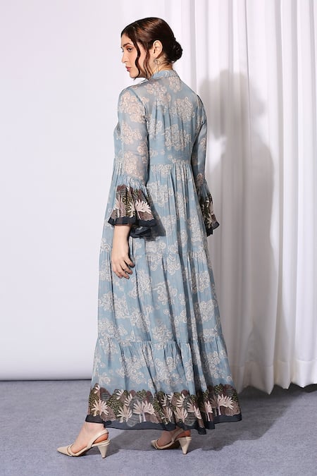 Powder blue maxi dress with tiered detail, placement embroidery, bell sleeves & abstract print.