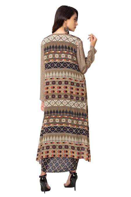Beige Crepe Printed Jacket And Skirt Set