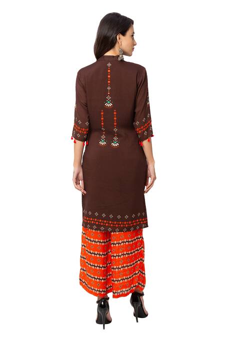 Coffee high-low kurta with floral printed motifs. Paired with printed palazzo.