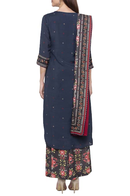 Blue wrap-style kurta with embroidered motifs. Comes with floral print palazzos & dupatta.