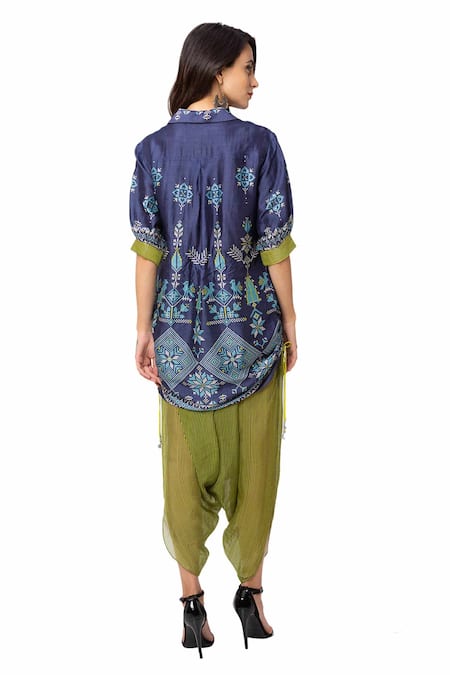 Dark blue kurta with pixel floral printed motifs & balloon sleeves. Paired with dhoti pant.