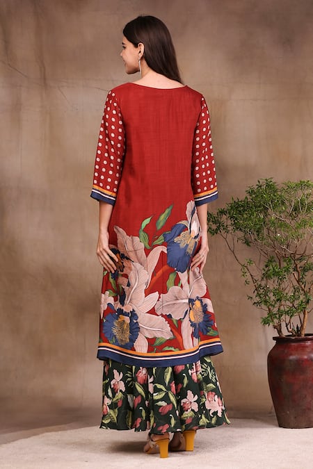 Red Malaysian And Cotton Round Printed Kurta With Skirt