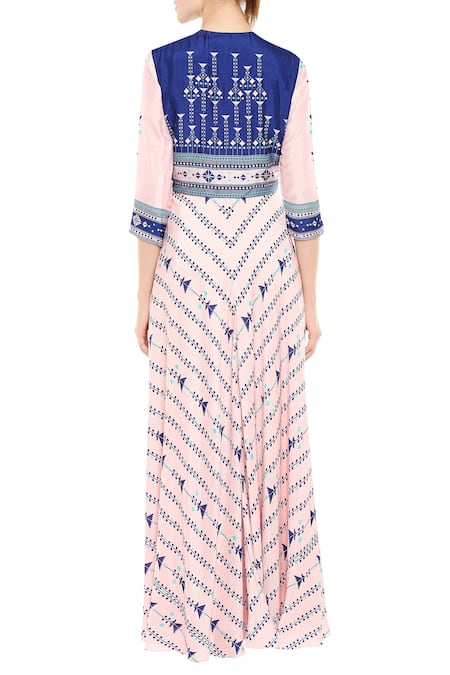 Blue Malayasian Silk Cutdana, Beads Printed Maxi Dress With Cropped Jacket