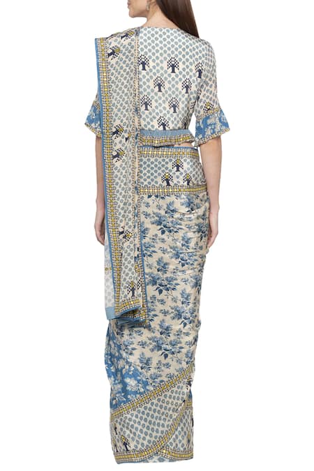 Blue & off white saree with all over floral print motifs & placement mirror work. Comes with printed blouse.