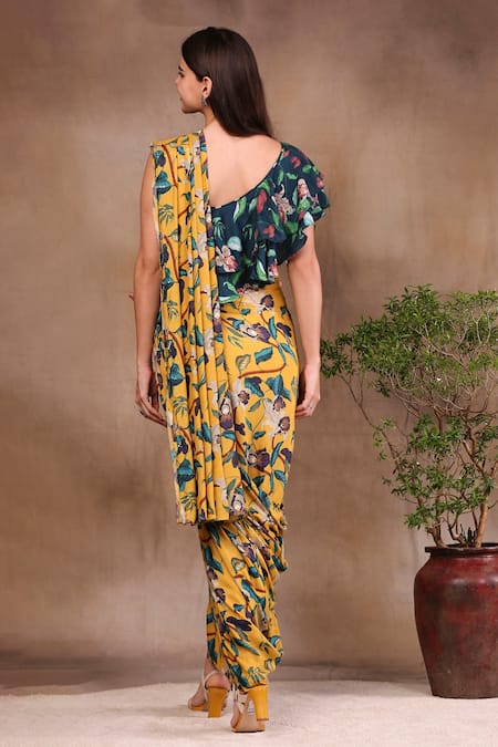 Yellow pre-draped saree with floral printed motifs. Comes with printed asymmetrical blouse.