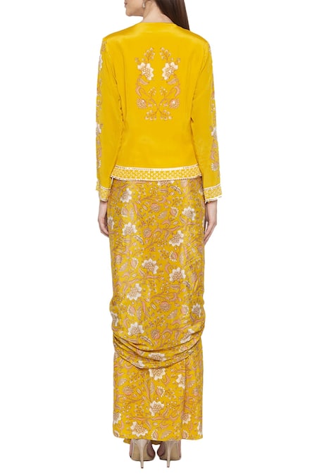 Yellow jacket-style top with all-over floral printed motifs & sequin embellished accents. Comes with a printed draped skirt.