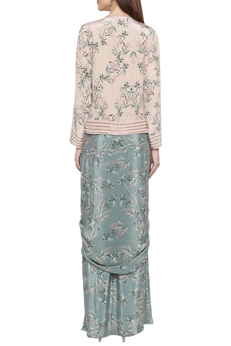 Pink jacket-style top with all-over floral printed motifs & sequin embellished accents. Comes with a blue printed draped skirt.
