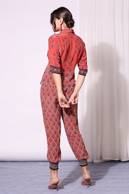 Blush red top with all-over floral print, collar, tie-up at the waist and cutwork hem. Comes with cuffed pant.