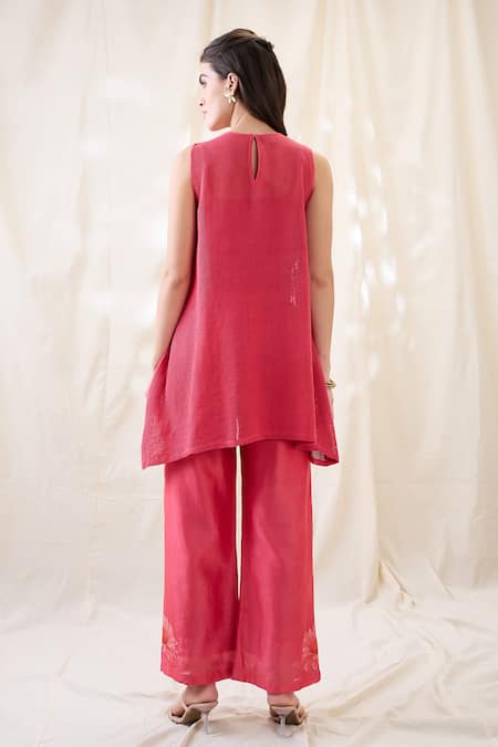 Pink tunic featuring hand embroidery with floral motifs. Paired with coordinating pink wide-leg pants made from Chanderi fabric.