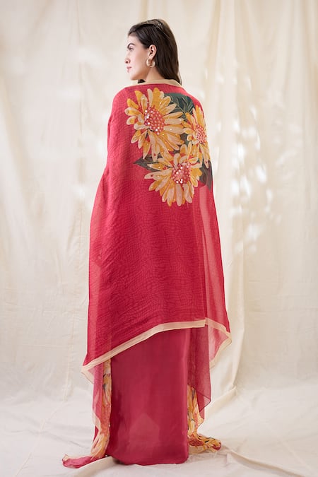 Hand embroidered floral design on bustier, Flowing cape with vibrant floral print, Draped skirt with ruffled detailing