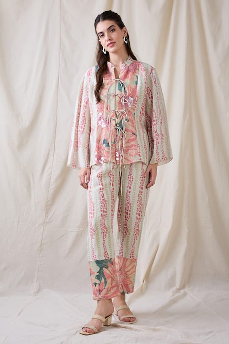 Multicolor co-ord set featuring a jacket top with hand embroidery and front tie-ups. Paired with matching pants with an elastic closure.