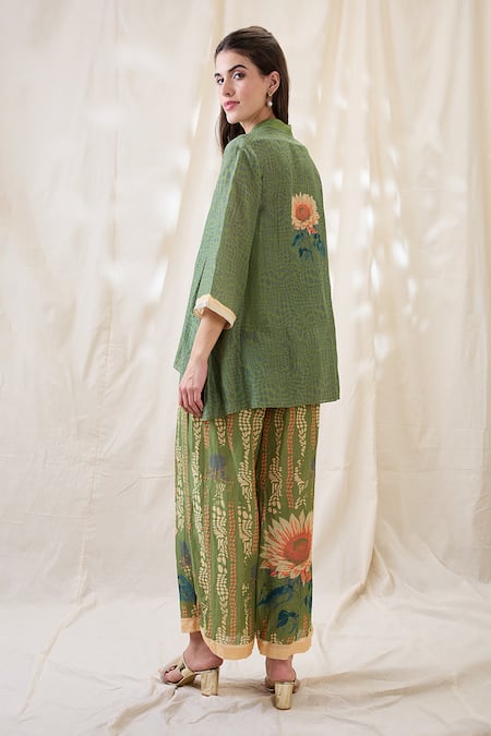 Green co-ord set featuring a short tunic and wide-leg pant. The tunic showcases hand embroidery with floral motifs and has a relaxed fit.