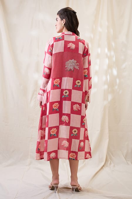 Hand embroidery details on the dress, Floral motifs on the jacket, Contrasting check pattern on the jacket