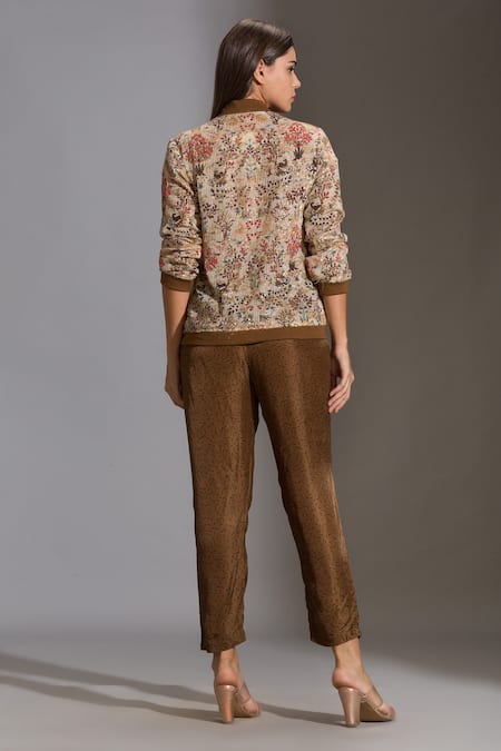 Beige bomber jacket with floral printed motifs, front-zipper & sequin work. Paired with printed pant.