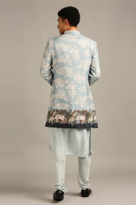 Blue jacket style bandhgala with cloud print & patch pocket. Paired with kurta & churidar.