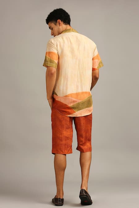 Beige shirt with nature print & notched collar. Paired with shorts.