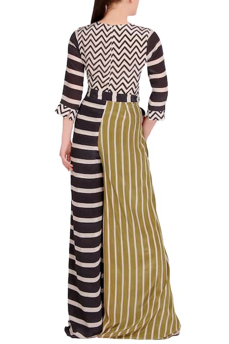 Multi color flared jumpsuit with tie up belt & all-over stripes. Components: 2 Three quarter sleeves Closure: Back zip