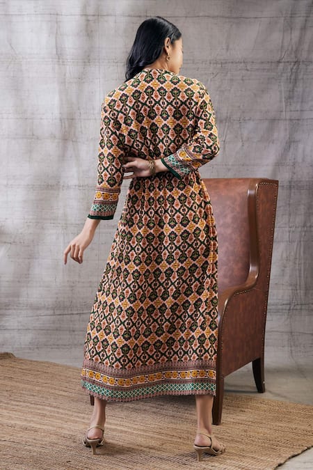 Multicolor midi dress featuring a band collar, long sleeves, and a front zipper detailing
