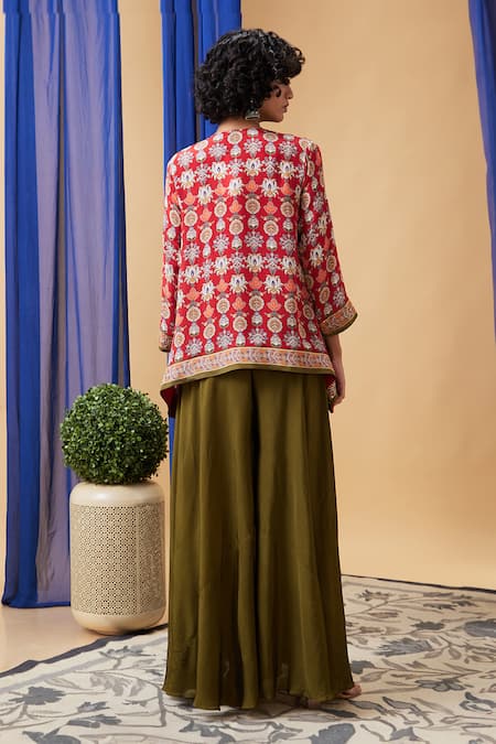 Red crepe jacket featuring floral and abstract prints with a V-neckline. Paired with a sleeveless padded blouse and green palazzo pants.