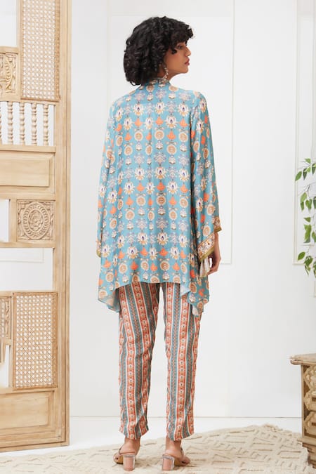 Green cotton silk shirt featuring floral and abstract prints with a stand collar and flared sleeves. Paired with coordinating printed pants.