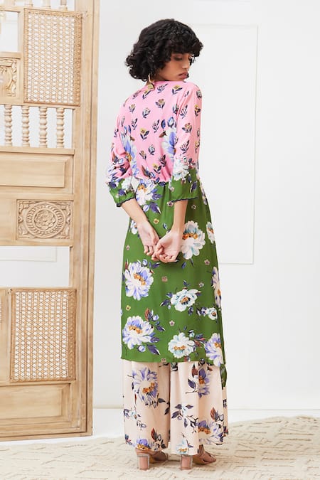 Multi-colored cotton silk jacket with floral print and sequins embroidery. Paired with a matching sharara and sleeveless top.