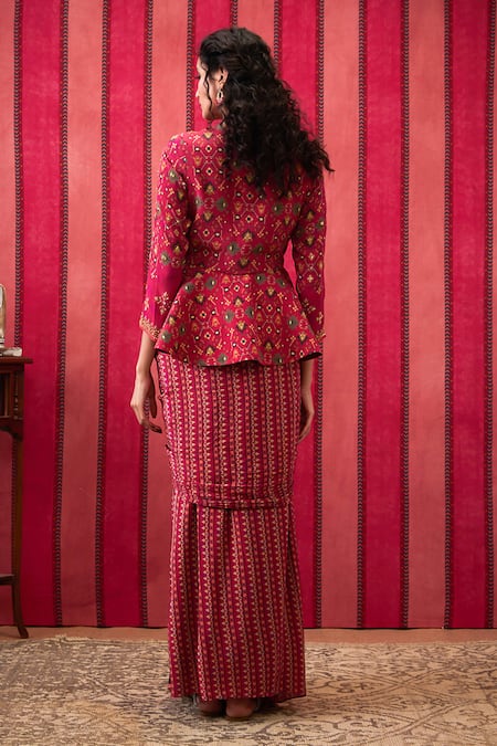 Pink peplum top featuring sequin embroidery and a stand collar. Paired with a draped skirt showcasing intricate patterns.