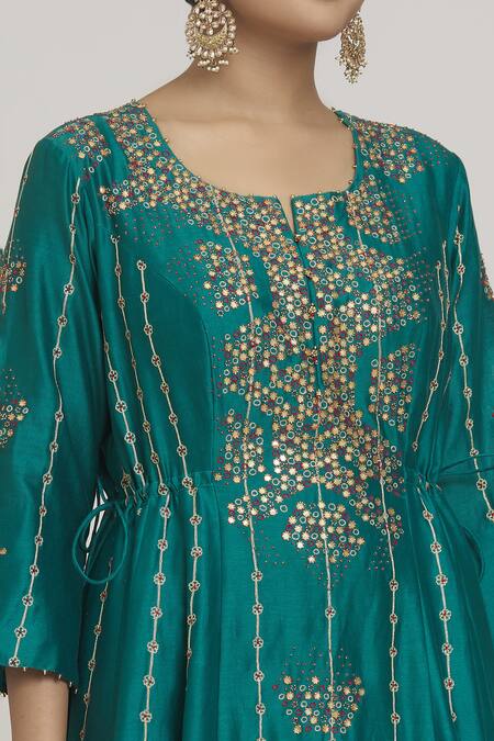 Cerulean blue asymmetric hem anarkali featuring bead and gota embroidered dot cluster motifs. Paired with an embroidered sharara and dupatta.