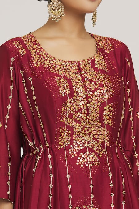 Maroon asymmetric hem anarkali featuring bead and gota embroidered dot motifs. Paired with an embroidered sharara and dupatta.
