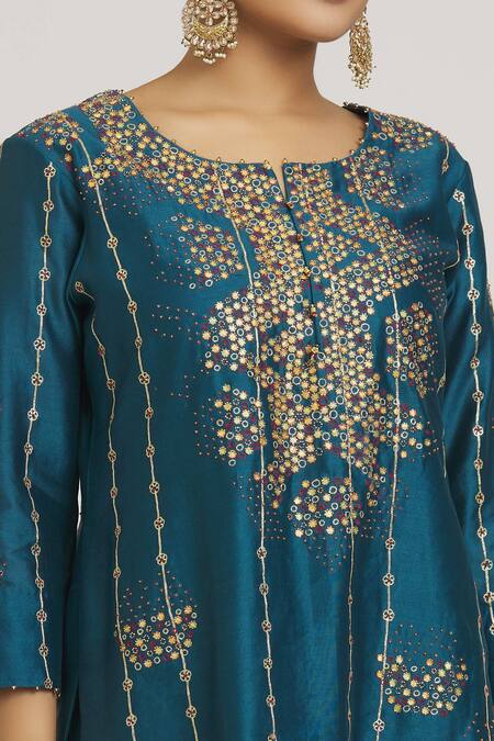 Cobalt blue kurta featuring bead and gota embroidered dot motifs. Paired with an embroidered sharara and dupatta, both adorned with zardozi work.