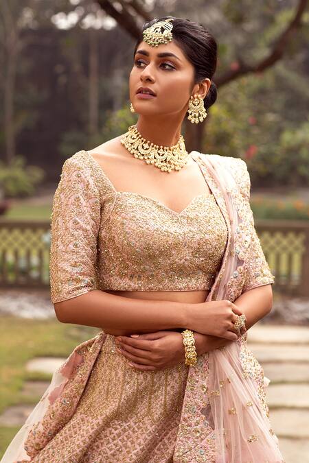 Light pink lehenga with attached cancan, all-over contrast resham and zardozi embroidered floral motifs. Comes with embroidered sweetheart neckline padded blouse and tulle dupatta.