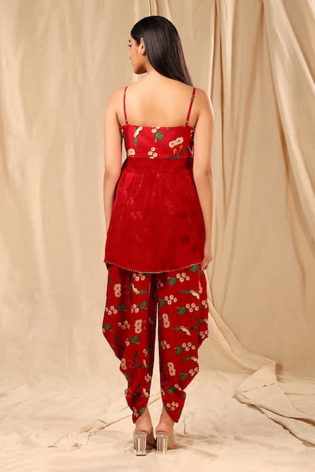 Red peplum top with front slit & aari work. Paired with spring print dhoti pant.
