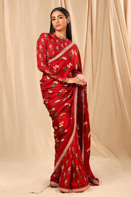 Red saree made from raw silk featuring spring blossom print and embroidered border. Paired with a 1.5 meter unstitched blouse piece in cotton candy fabric.