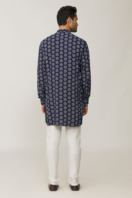 Navy blue kurta featuring a geometric print, mandarin collar, and full sleeves. Paired with a white churidar that includes an elasticated waistband and side pockets.