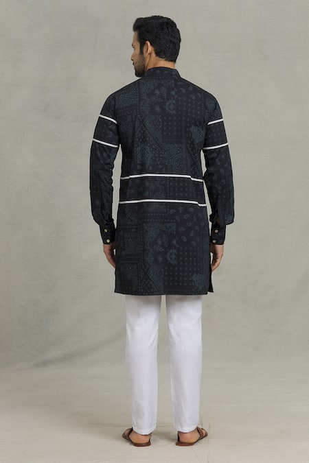 Black kurta featuring paisley print, mandarin collar, and full sleeves. Paired with white pants for a complete look.