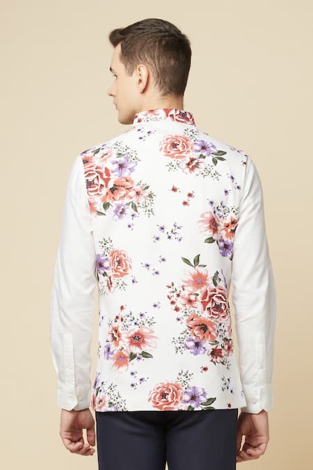White floral printed bundi featuring a mandarin collar and sleeveless design. Paired with a full-sleeve white shirt and navy pants.
