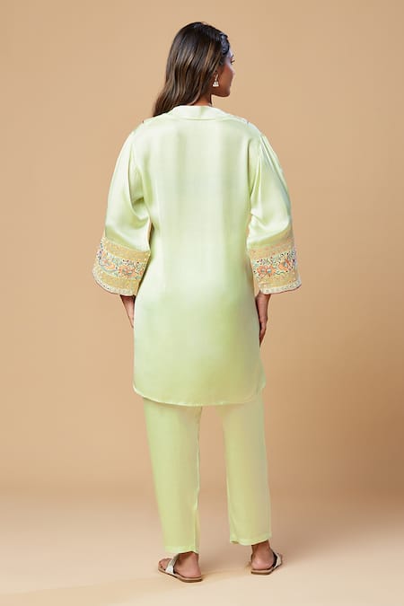 Mint green kurta featuring embroidered neckline and three-quarter sleeves. Paired with matching pant that has embroidery at the side.