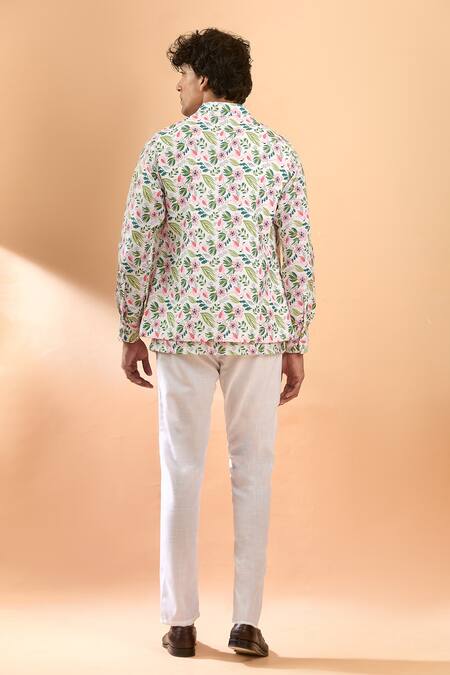 White jacket featuring multicolor floral and flamingo prints. Paired with a matching printed shirt and relaxed fit pants.