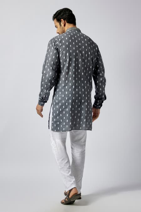 Grey kurta featuring ikat print, mirror work embroidery, and full sleeves. Paired with a matching pant for a complete look.